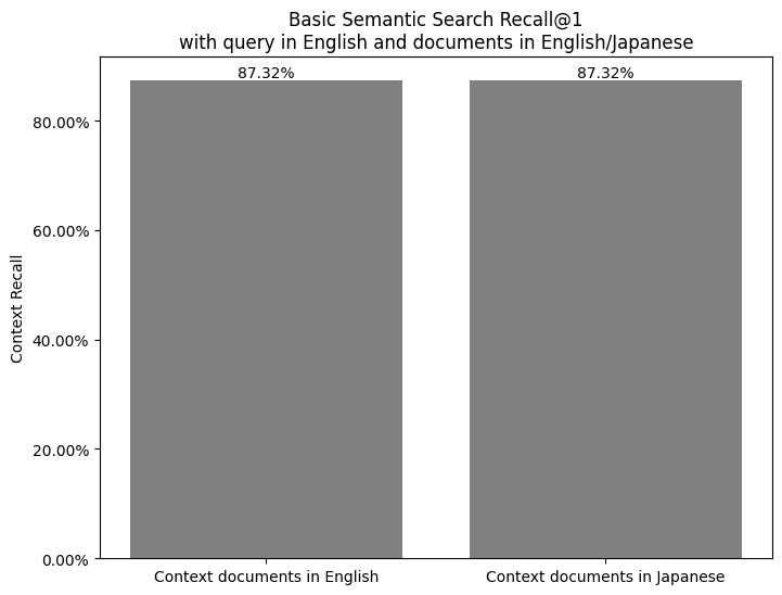 While running an evaluation in Ragas, I have noticed that the basic semantic search returns the correct document 87% of the time, and that it doesn’t matter if the retrieved document is in Japanese or English. Data sources were interchangeable. The incorrectly retrieved documents also showed the same pattern. The RAG was making the same mistakes, no matter the language selected by the user.